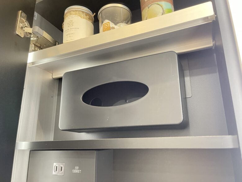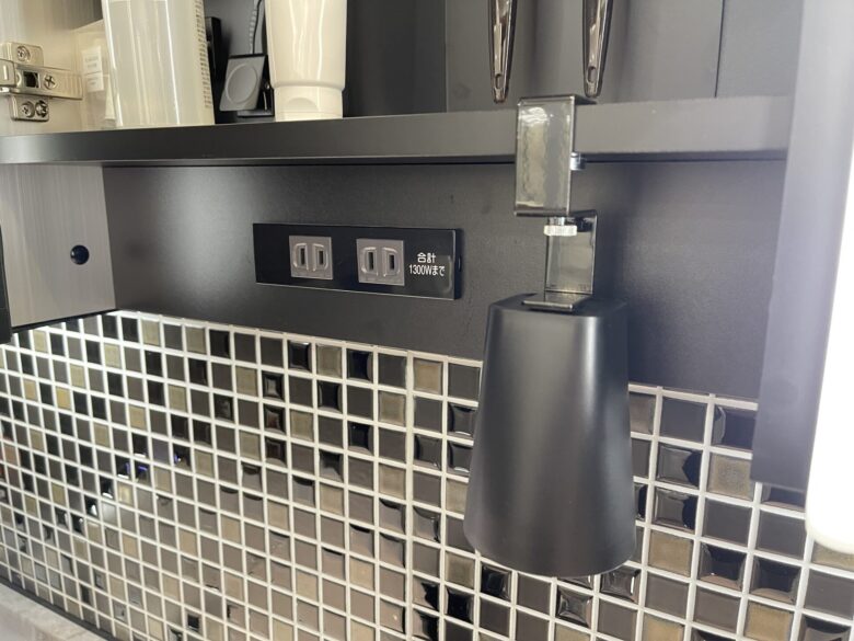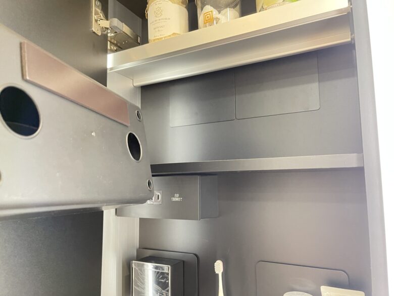 鏡の裏はコンセントや可動棚が設置されており、自分の思うままに収納することができます。